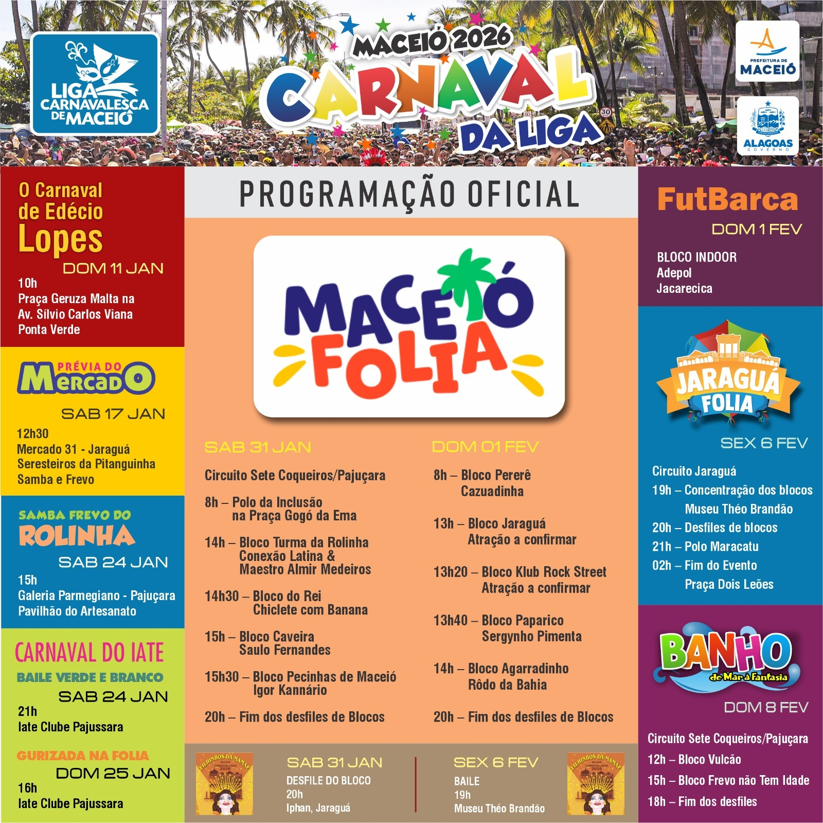 Sob a marca Maceió Folia, o calendário se estende por janeiro e fevereiro, com atividades espalhadas por pontos emblemáticos da cidade como Ponta Verde, Pajuçara, Jaraguá e Sete Coqueiros. Entre os destaques estão o Carnaval de Edécio Lopes, a Prévia do Mercado, o Samba Frevo do Rolinha, o Carnaval do Iate, além de eventos como FutBarca, Jaraguá Folia e o irreverente Banho de Mar à Fantasia.