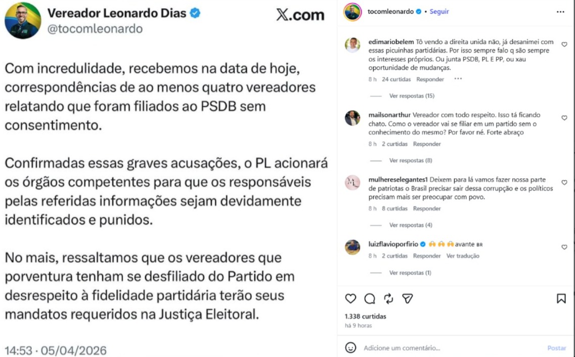 A denúncia ganhou força porque não partiu de boato de bastidor, mas de um pronunciamento direto de um dos principais nomes do PL na Câmara de Maceió. Em sua manifestação nas redes sociais, Leonardo Dias afirmou ter recebido correspondências de vereadores relatando filiação indevida ao PSDB e anunciou que o partido pretende acionar os órgãos competentes para identificar e punir os responsáveis, caso as acusações sejam confirmadas. Ele também advertiu que parlamentares que tenham deixado o partido em desrespeito à fidelidade partidária poderão ter os mandatos questionados judicialmente.