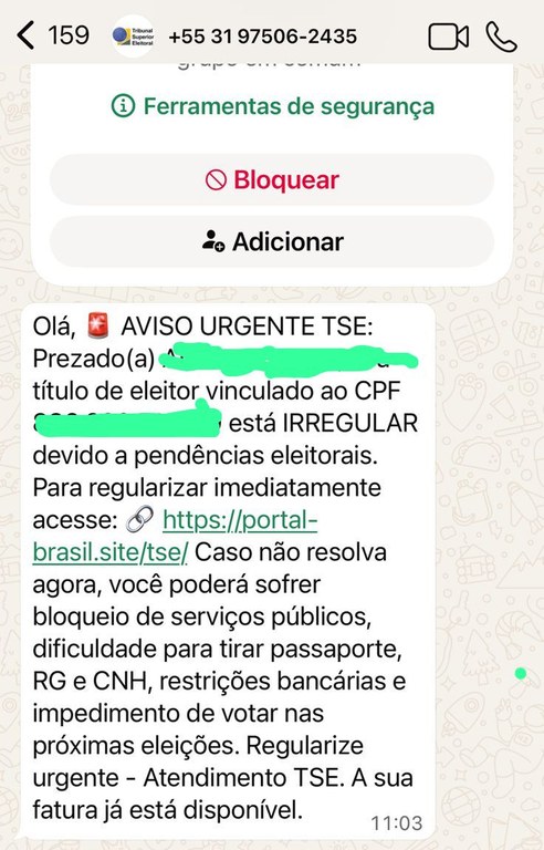A mensagem fraudulenta que o TRE/AL teve acesso informa que uma suposta “situação irregular” perante a Justiça Eleitoral poderia suspender o acesso a serviços bancários ou a outros serviços oficiais do governo.