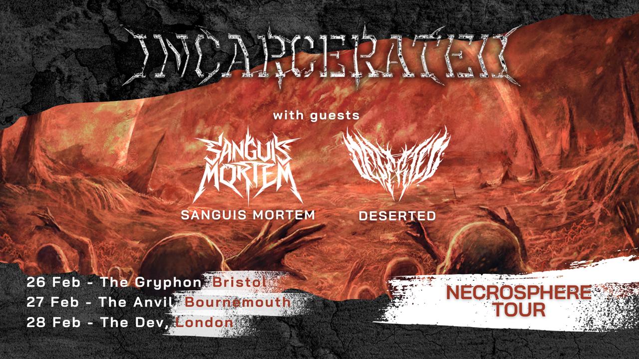A banda de Death/Thrash Metal INCARCERATED acaba de anunciar a "Necrosphere Tour", uma série de shows pela Europa para promover seu álbum de estreia, “Necrosphere”. Lançado digitalmente de forma independente no dia 30 de janeiro, o disco sairá em versão física em breve, em formatos CD e vinil.