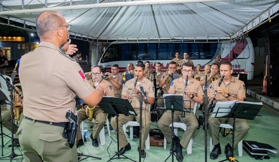 O clima frio das noites de inverno no Sertão de Alagoas deu lugar ao calor da animação para dezenas de pessoas que prestigiaram uma apresentação inédita do Centro Musical da PM. O espetáculo aconteceu nesse sábado (19), na praça Nossa Senhora da Penha, em Batalha.