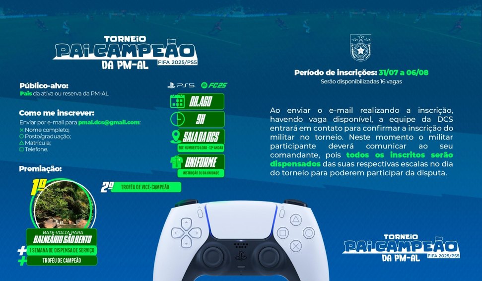 Por meio da plataforma Console Playstation 5, o sistema de disputa entre os pais ocorrerá na modalidade eliminatória simples (mata-mata), com simulação de jogos on-line. As inscrições estão abertas e seguem até o dia 6 de agosto, limitadas a 16 vagas, por ordem de chegada dos pedidos ao e-mail [email protected]. Podem participar pais da ativa ou da reserva remunerada da corporação. Aos da ativa, serão limitadas até duas vagas por unidade.