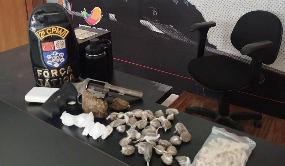 Com ele, foram apreendidos um revólver calibre 38 com cinco munições, além de 64 gramas de maconha, 116 pedras de crack e 34 gramas de cocaína.