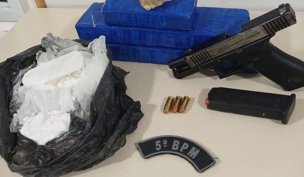 O rapaz foi alcançado e, durante a busca pessoal, estava com uma pistola na cintura. Na sacola que ele transportava, os militares encontraram 2kg de maconha, 700 gramas de cocaína e 50 gramas de crack.