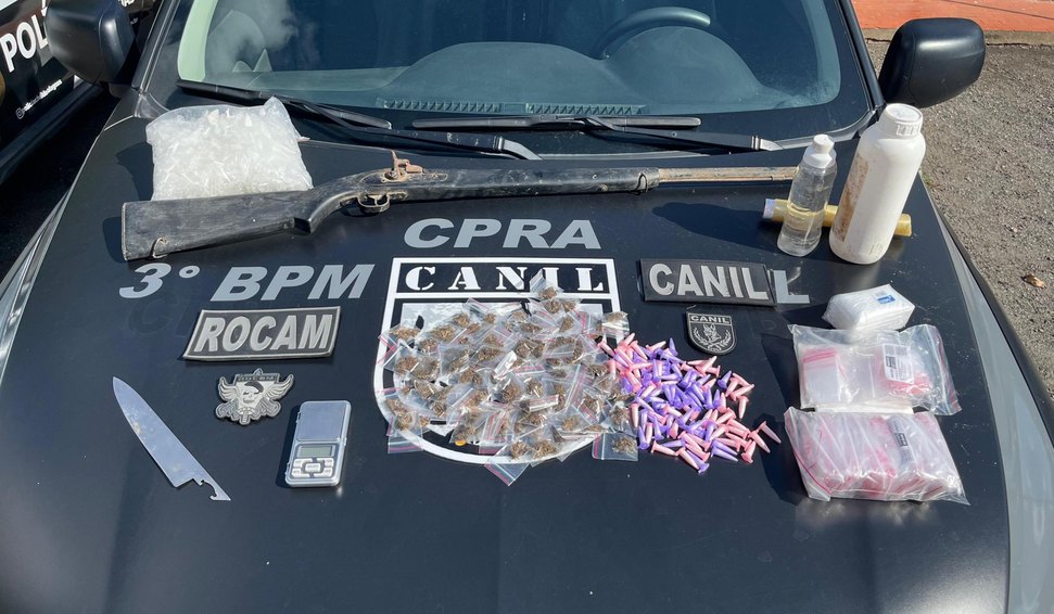 Chegou ao conhecimento da PM que indivíduos estariam fracionando drogas e escondendo o material em uma área de mata, no final de uma localidade conhecida como Rua do Amor. Na chegada, um indivíduo notou a presença da polícia e foragiu pela vegetação. As equipes realizaram buscas na região, inclusive com o emprego dos cães farejadores K9 Luna e Beretta. Foi encontrado um balde contendo parte dos itens ilícitos. A arma foi localizada em outro ponto da mata.