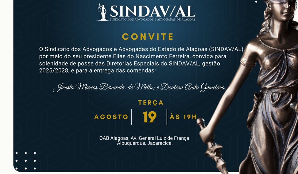 Para celebrar o mês da advocacia, o Sindicato dos Advogados e Advogadas do Estado de Alagoas (Sindav/AL) irá realizar a posse das Diretorias Especiais do Sindav/AL e a outorga das comendas "Jurista Marcos Bernardes de Mello" e "Doutora Anita Gameleira". O evento acontece amanhã, terça-feira (19), às 19h, no prédio da Ordem dos Advogados do Brasil, seccional Alagoas, (OAB/AL).