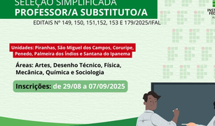 O Instituto Federal de Alagoas (Ifal) inicia nesta sexta-feira (29) as inscrições para seleção simplificada de professor substituto em seis diferentes campi, são eles: Piranhas, São Miguel dos Campos, Coruripe, Penedo, Palmeira dos Índios e Santana do Ipanema. As inscrições são gratuitas e acontecem até o dia 7 de setembro, por meio da página de Concursos do Ifal. Confira os detalhes abaixo: