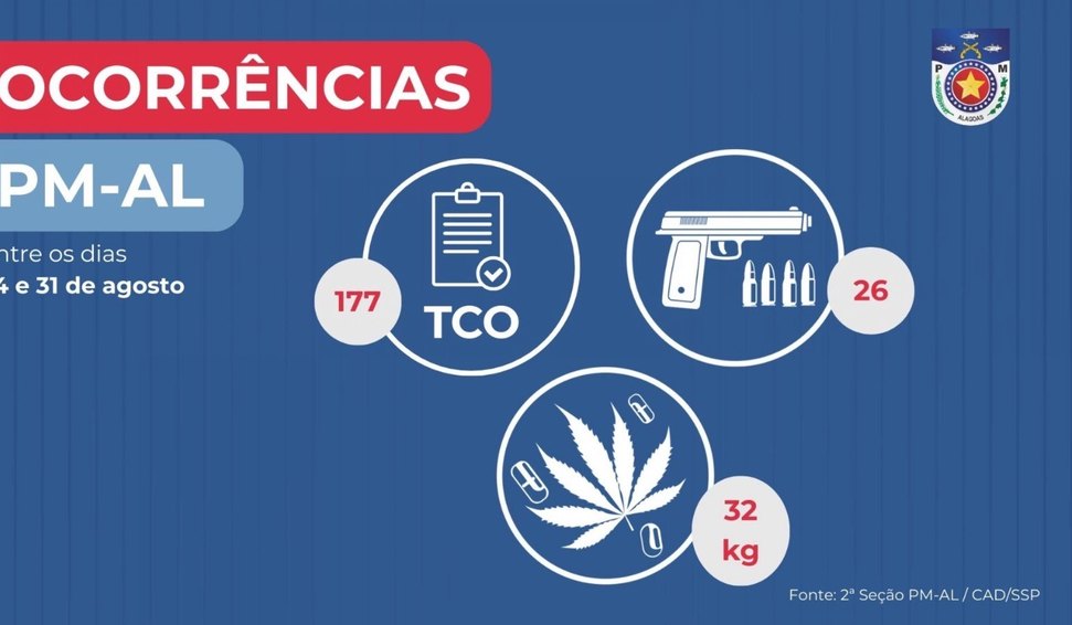 A Polícia Militar encerrou o mês de agosto com índices expressivos nas apreensões de ilícitos em Alagoas. Dados do setor de Estatística e Ciência Aplicada da Instituição mostram que 26 armas de fogo e 32 quilos de entorpecentes foram retirados de circulação durante a última semana. Os números correspondem ao período entre 23 e 30 de agosto.