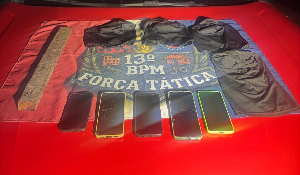 Após a abordagem, os policiais encontraram quatro balaclavas, uma barra de madeira com pregos e cinco celulares. Diante da coincidência das características descritas pelas vítimas, os suspeitos receberam voz de prisão e foram conduzidos até a Central de Flagrantes, no Tabuleiro do Martins.