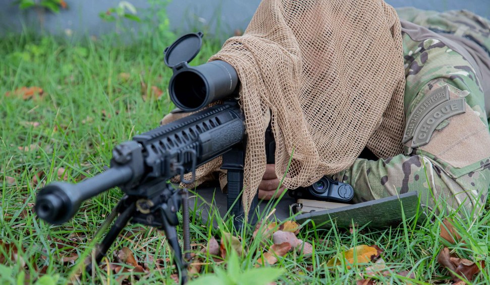 Outro princípio chave é “ver sem ser visto”. Significa que dominar a furtividade é imprescindível. “O atirador de precisão precisa trabalhar muito bem a técnica da camuflagem. Deve se adequar ao ambiente de acordo com a necessidade para que ele não seja visto, não seja percebido. Isso confere uma vantagem tática, porque se ele precisar sair do local, fará isso mais rapidamente, porque ninguém saberá onde ele está”, frisou.