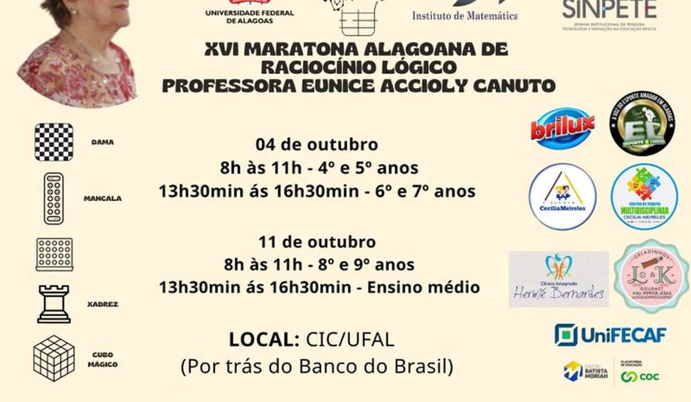 O Instituto de Matemática (IM) da Ufal vai promover, nos dias 4 e 11 de outubro, a 16ª Maratona Alagoana de Lógica. As escolas públicas e privadas têm até a essa sexta-feira (19) para se inscrever na competição que tem o objetivo de estimular a memória, capacidade de raciocínio e criatividade dos estudantes por meio de provas, jogos e desafios lógicos.