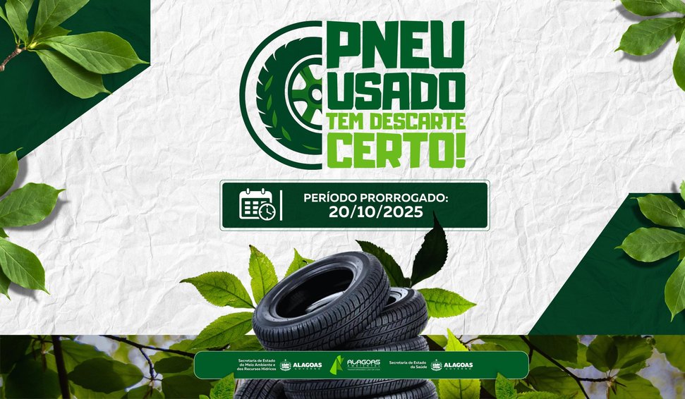 Realizada em parceria com a empresa Alagoas Ambiental e com as secretarias municipais, a iniciativa já vem registrando recordes de recolhimento. Segundo o secretário de Estado de Meio Ambiente e Recursos Hídricos, Judson Cabral, o novo prazo possibilita maior adesão dos municípios e amplia o alcance da mobilização. “Estamos muito felizes em dar continuidade ao recolhimento de pneus que já não estão em uso. Essa é uma ação de saúde pública e de cuidado com o meio ambiente que vem batendo recordes, mostrando a força dessa campanha. Com a prorrogação, mais municípios poderão participar e somar a essa iniciativa”, afirmou.