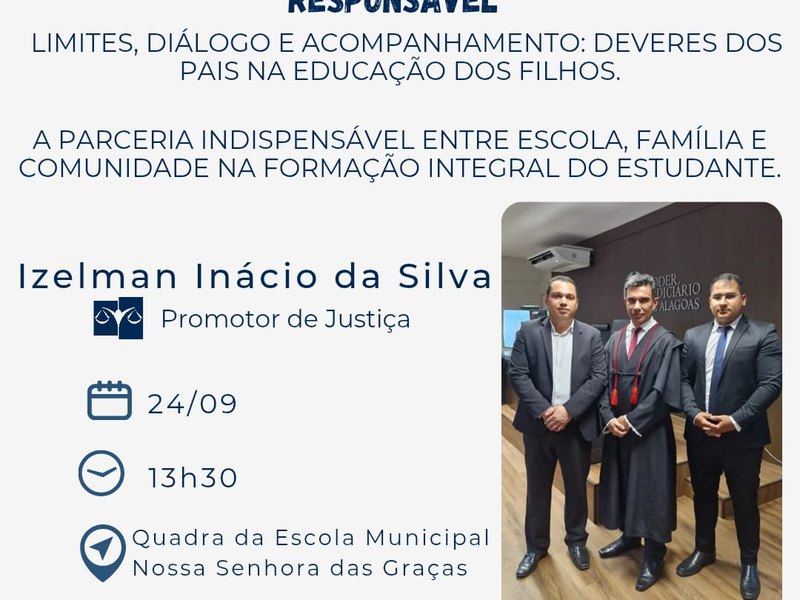 A palestra foi ministrada pelo promotor de Justiça Izelman Inácio que, após sua fala, deu oportunidade para que os alunos pudessem esclarecer dúvidas e dialogar diretamente com o representante do Ministério Público. “Vale destacar que quando o Ministério Público promove esse diálogo com crianças e adolescentes, contribui para que eles compreendam seus direitos e deveres, reconheçam a necessidade do respeito ao próximo e se tornem protagonistas na promoção de uma convivência mais harmônica. Essa iniciativa ainda visa estimular a cultura de paz nas escolas, o que significa investir na prevenção da violência e no fortalecimento dos laços comunitários, criando ambientes mais acolhedores e seguros”, disse ele.
