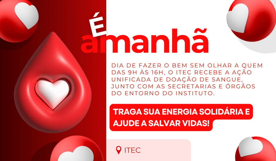 O Instituto de Tecnologia em Informática e Informação de Alagoas (Itec) será ponto de solidariedade nesta terça-feira (7), das 9h às 16h, durante a Ação Unificada de Doação de Sangue, promovida em parceria com o Hemoal e as secretarias e órgãos do entorno do instituto.