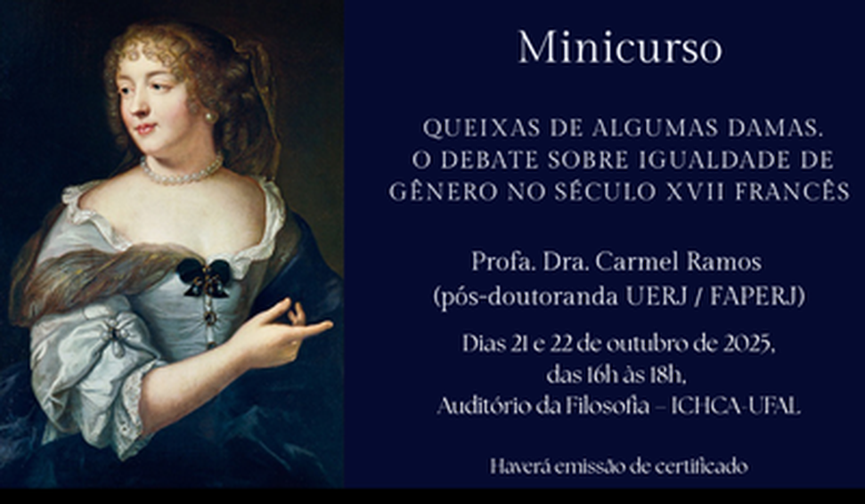 Nos dias 21 e 22 de outubro, a Universidade Federal de Alagoas (Ufal) sediará o minicurso Queixas de Algumas Damas. O Debate sobre Igualdade de Gênero no Século XVII Francês. A atividade será realizada no Auditório de Filosofia, no Instituto de Ciências Humanas, Comunicação e Artes (Ichca), no Campus A. C. Simões, das 16h às 18h, sob a condução da professora Carmel Ramos, doutora em Filosofia da Universidade do Estado do Rio de Janeiro (UERJ).