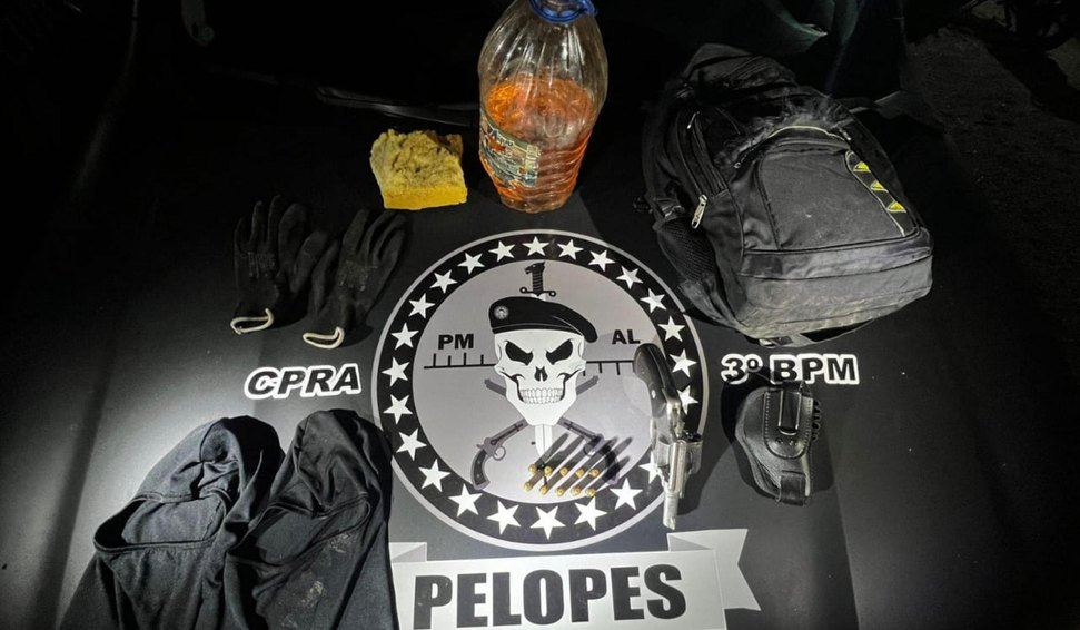 Diante da fundada suspeita, foi realizada a abordagem. Foi identificado que os indivíduos utilizaram um ciclomotor de cor azul, modelo Jonny, sem placa de identificação. Na busca pessoal, com o condutor, foi encontrado um revólver calibre 38, com 10 munições. Durante as buscas na mochila foram encontradas ainda duas balaclavas (touca tipo ninja), um garrafão contendo gasolina e um par de luvas pretas. Autor e material foram encaminhados à Central de Polícia Civil.