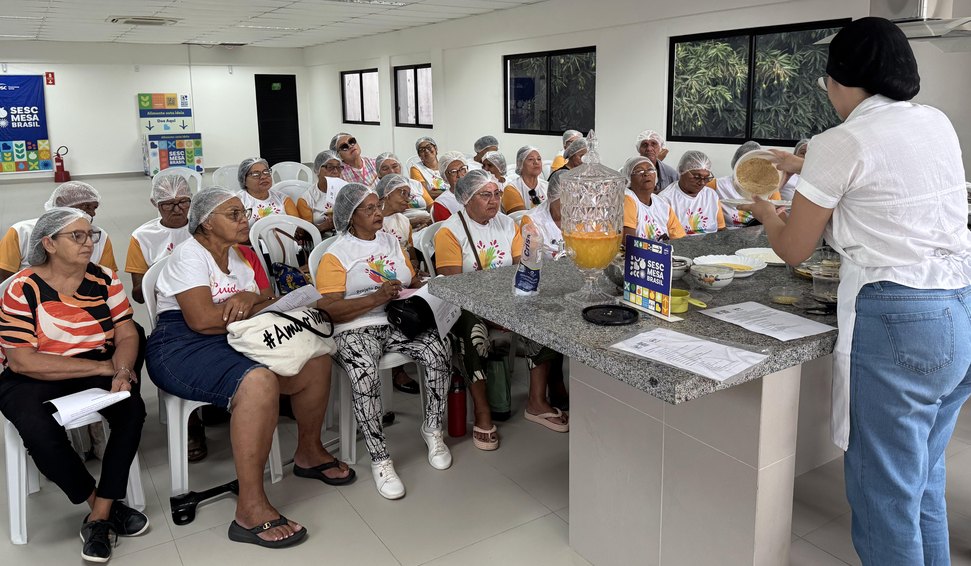 A cozinha experimental do Sesc Mesa Brasil, em Maceió, se transformou em um espaço de aprendizado e boas práticas alimentares durante as oficinas de aproveitamento integral de alimentos conduzidas pelas nutricionistas do Sesc, Luciana Barros e Waleska da Rocha, nesta terça (28) e quarta-feira (29), de forma gratuita. Com o objetivo de incentivar o consumo consciente e saudável, reduzindo o desperdício de alimentos, a iniciativa reuniu cerca de 50 idosos do Centro de Convivência da Pessoa Idosa Novo Despertar, ligado à Pestalozzi.