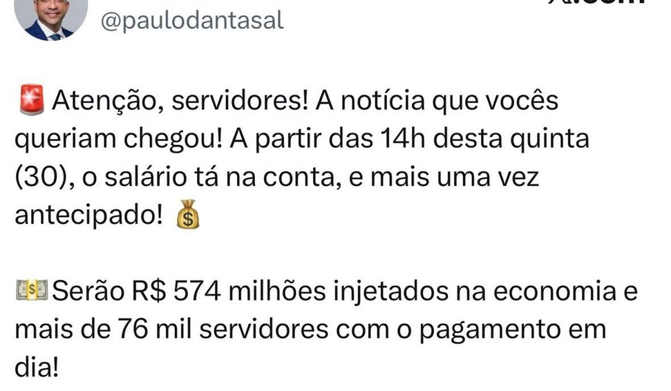 O anúncio foi feito nas redes sociais do governador, em tom de comemoração. “Atenção, servidores! A notícia que vocês queriam chegou! A partir das 14h desta quinta (30), o salário tá na conta, e mais uma vez antecipado. Serão R$ 574 milhões injetados na economia e mais de 76 mil servidores com o pagamento em dia!”, publicou Dantas.