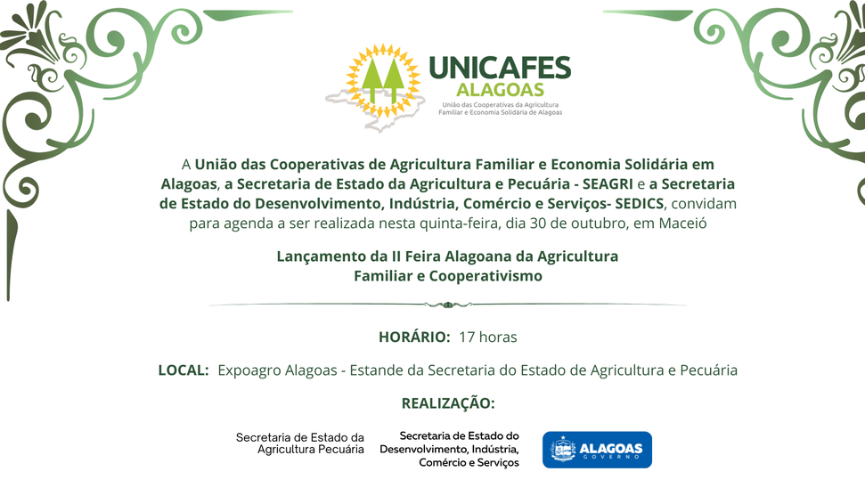 A União das Cooperativas de Agricultura Familiar e Economia Solidária em Alagoas (Unicafes-AL), juntamente da Secretaria do Estado de Agricultura e Pecuária (Seagri-AL) e da Secretaria do Estado de Desenvolvimento, Indústria, Comércio e Serviços (Sedics-AL) irão anunciar nesta quinta (30) a II Feira Alagoana da Agricultura Familiar e Cooperativismo. O evento acontece às 17h, durante a Expoagro 2025.