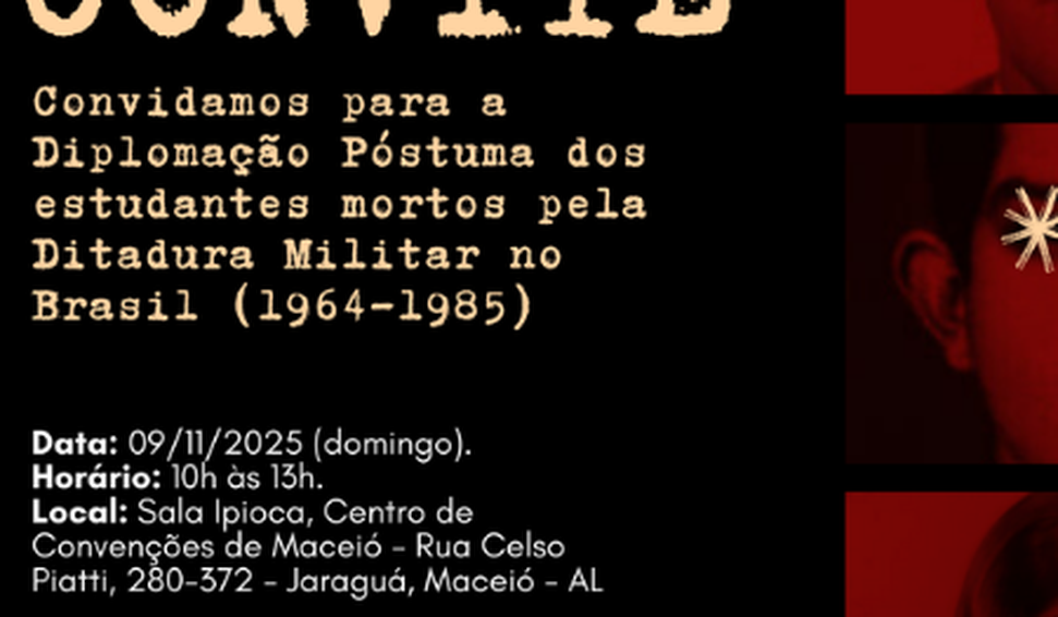 No domingo (9), a Universidade Federal de Alagoas (Ufal) realizará a diplomação póstuma de três estudantes perseguidos e mortos pela Ditadura Militar (1964-1985), na 11ª Bienal Internacional do Livro de Alagoas. A solenidade ocorrerá às 10h, na Sala Ipioca do Centro de Convenções de Maceió, e contará com a presença de familiares dos estudantes mortos, autoridades, comunidade acadêmica e membros da sociedade civil. O evento será gratuito e não precisa de inscrição prévia.