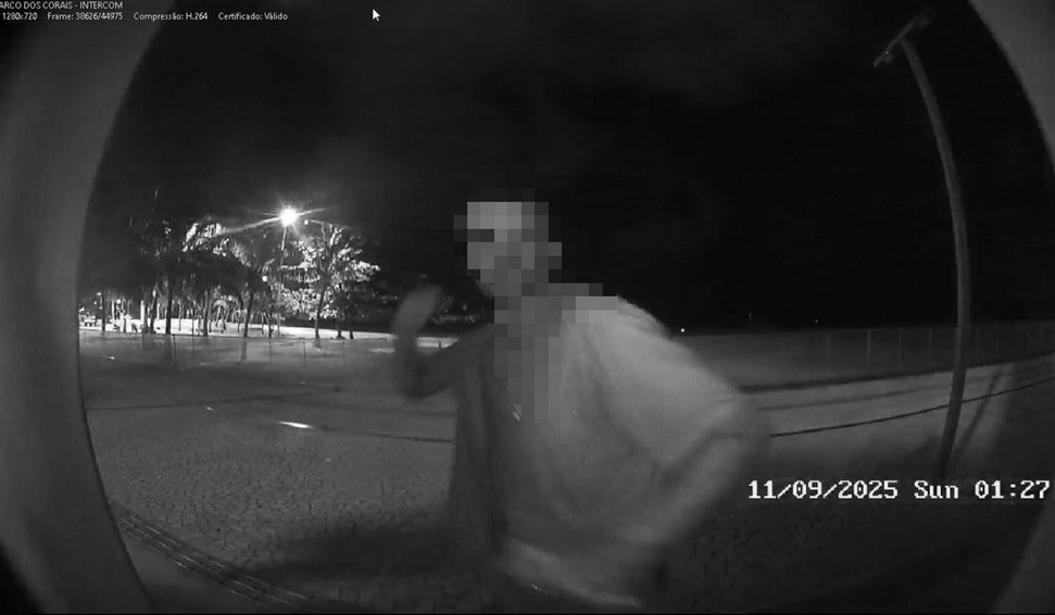 O suspeito chegou a acionar o botão de pânico, recurso disponível à população para situações de emergência, e, durante o atendimento dos agentes sobre uma possível ocorrência, desferiu um soco em direção à câmera do equipamento localizado no Marco dos Corais, na Ponta Verde.