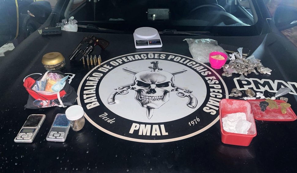 Após monitoramento, os policiais flagraram o indivíduo desenterrando e organizando o material ilícito. Durante a abordagem, foram apreendidos cerca de 390 gramas de maconha, 95 gramas de crack e uma balança de precisão. O suspeito ainda indicou a existência de uma arma de fogo guardada na residência de um familiar. No local, com autorização da moradora, foi localizado um revólver calibre 38, com três munições intactas.