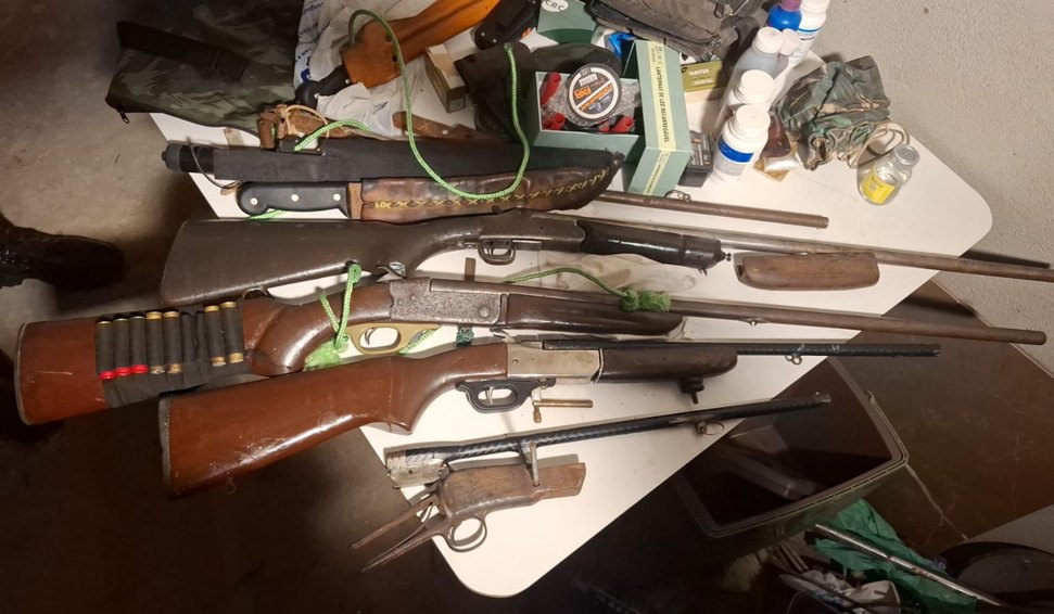 Com o apoio da população, os policiais localizaram ainda um indivíduo que mantinha uma espingarda e um revólver calibre 38 em sua residência. Após vistoria autorizada pelo proprietário, foram encontrados, além das armas, dois recipientes de pólvora e quantidades de chumbo.