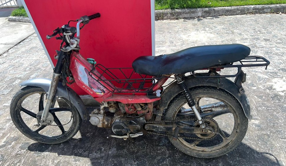 Na vistoria, constatou-se que a motocicleta era uma Shineray XY 50Q vermelha. Embora o chassi estivesse regular, a identificação do motor estava suprimida (raspada), caracterizando crime conforme o artigo 311 do Código Penal Brasileiro (adulteração ou supressão de sinais identificadores de veículo automotor).