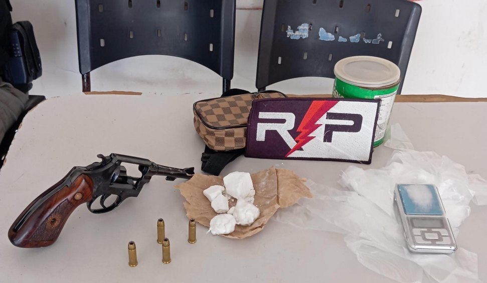 A arma e parte da droga foram localizadas após um homem ser abordado em uma motocicleta na porta de um imóvel aparentemente abandonado. Durante a abordagem, o suspeito alegou portar a arma de fogo por ter sido vítima de uma tentativa de homicídio. Além do revólver, foram apreendidos cerca de 50 gramas de cocaína e uma balança de precisão.