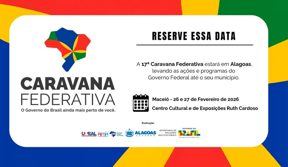 A Secretaria de Estado da Cultura e Economia Criativa de Alagoas (Secult) está convocando gestores municipais, fazedores de cultura e representantes da sociedade civil para participarem da 16ª edição da Caravana Federativa do Governo Federal, que acontece nos dias 26 e 27 de fevereiro, no Centro Cultural e de Exposições Ruth Cardoso, em Maceió.