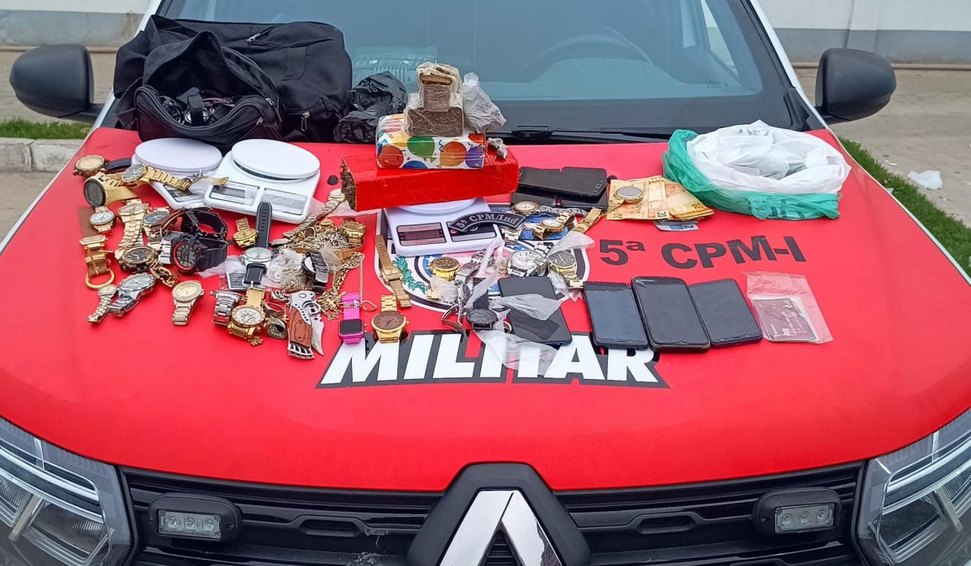 Na sequência das buscas, os policiais localizaram um tablete de cerca de 1 kg de maconha e dinheiro em uma sacola sobre a mesa onde o suspeito estava. Com autorização, a equipe seguiu até a residência do homem, onde encontrou 1,724 kg de maconha, três balanças de precisão, sete celulares, uma máquina de cartão, um canivete, R$ 228 em espécie, mais de 25 relógios de pulso, correntes e anéis.