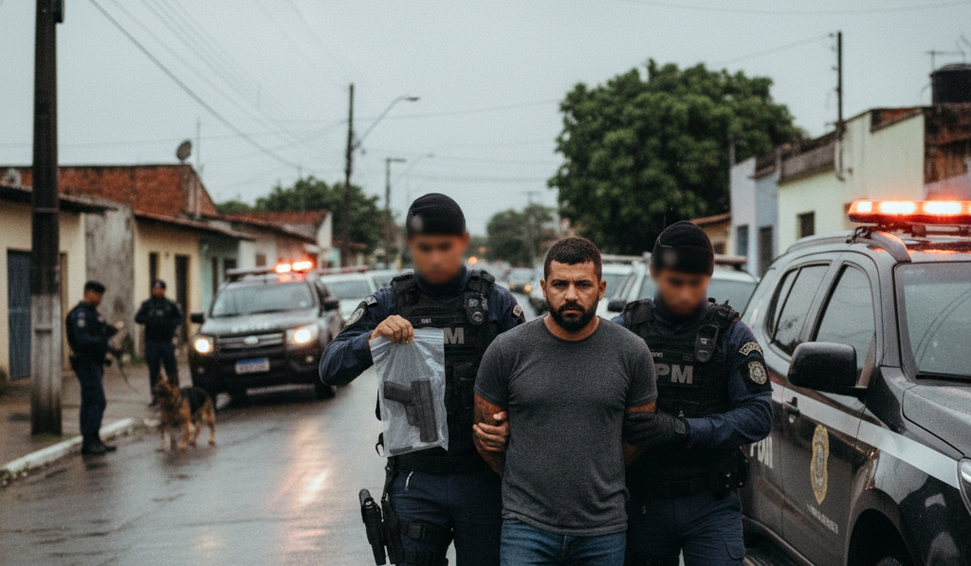 A prisão foi efetuada por uma guarnição do 12º Batalhão da Polícia Militar após denúncia anônima informando que um indivíduo estaria circulando armado pela Avenida Dr. Fernando de Couto Malta. Os policiais se deslocaram até o local indicado para averiguação.