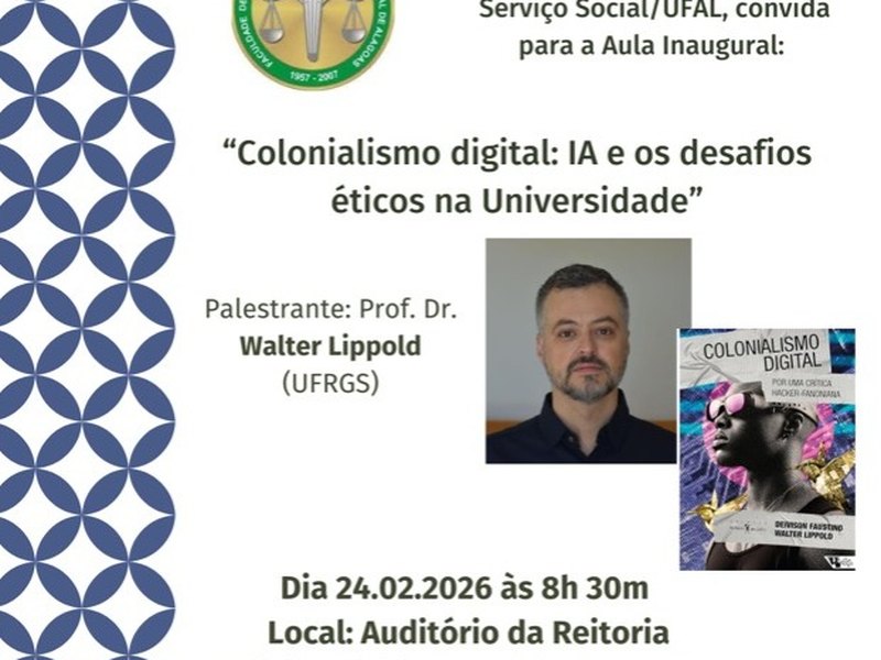 Na Faculdade de Serviço Social (FFSO/Ufal), os calouros vão ter programação a semana inteira, a partir do dia 23 de fevereiro, às 8h. Encontro com a coordenação e lanche coletivo são só uma prévia do que vem por aí. A coordenação do curso promove já na terça-feira (24), duas aulas inaugurais. Abertas para estudantes de todos os cursos, os eventos acontecerão no auditório da Reitoria e terão emissão de certificado de horas. As inscrições podem ser feitas através do Sigaa ou presencialmente, pouco antes do horário de início. A primeira aula acontece pela manhã, às 8h30, quando o professor Walter Lippold (UFRGS) ministra a palestra “Colonialismo digital: IA e os desafios éticos na Universidade”. Doutor em História, o pesquisador atua em estudos sobre colonialismo digital, história da tecnologia, cibercultura e hacktivismo, além de integrar grupos de pesquisa na Universidade Federal Fluminense (UFF) e na Universidade Federal de São Paulo (Unifesp), sendo também autor do livro Colonialismo digital. Já à noite, às 19h, a professora Silvia Lema, docente da Universidad de la República (UdelaR), apresenta a conferência “O Serviço Social no contexto da crise estrutural: desafios e oportunidades”, trazendo reflexões a partir de sua atuação em políticas sociais, extensão universitária e metodologias participativas voltadas ao trabalho e à produção da vida social. Veja mais aqui.