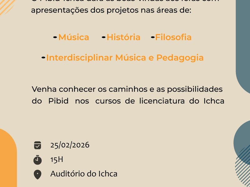 O Instituto de Ciências Humanas, Comunicação e Arte (ICHCA) preparou uma calourada conjunta para os cursos de licenciatura em Música, Teatro, História, Filosofia e Interdisciplinar em Música e Pedagogia. No dia 23 de fevereiro, às 19h, tem recital do professor José Fagundes.