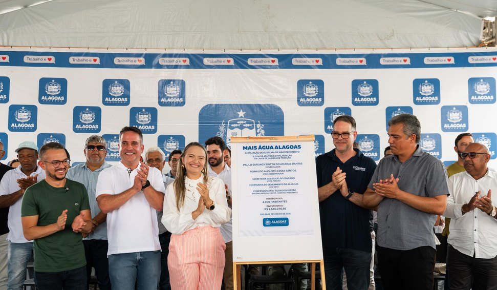 “É mais uma ação do Programa Mais Água Alagoas que, por meio dessa parceria público-privada, resolve definitivamente o problema de abastecimento de água aqui da cidade de São Brás”, disse o governador, ao lado do prefeito Klinger Quirino Santos.