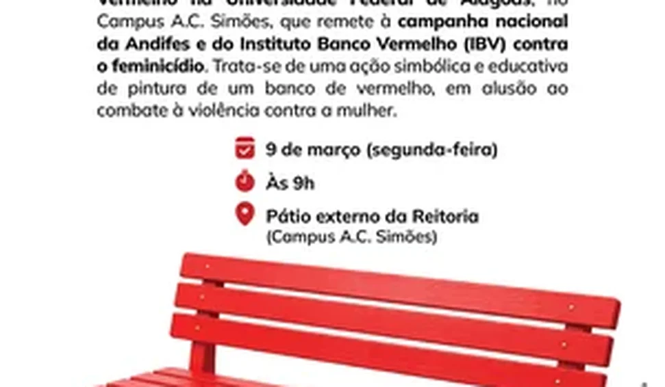A Universidade Federal de Alagoas (Ufal) reafirma seu compromisso com a defesa da mulher, contra todas as formas de violência. Por isso, disse sim ao chamado da Associação Nacional dos Dirigentes das Instituições Federais de Ensino Superior (Andifes) e aderiu à campanha nacional do Instituto Banco Vermelho (IBV) pelo feminicídio zero. No próximo dia 9 de março, às 9h, haverá uma ação simbólica e educativa de instalação de um banco vermelho no pátio da Reitoria, no Campus A.C. Simões, em Maceió.