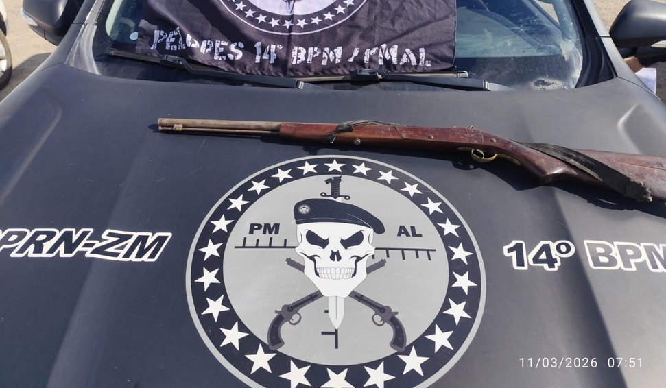 Na zona rural de Joaquim Gomes, o 14º BPM localizou uma oficina de manutenção de armas no sítio Pará, instalada em uma residência. No local, os policiais encontraram uma espingarda artesanal do tipo soca-tempero, além de peças de armamentos.