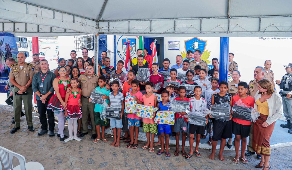 Em continuidade ao policiamento de proximidade, jovens da região participaram da entrega simbólica de chuteiras, que serão utilizadas em atividades esportivas locais.
