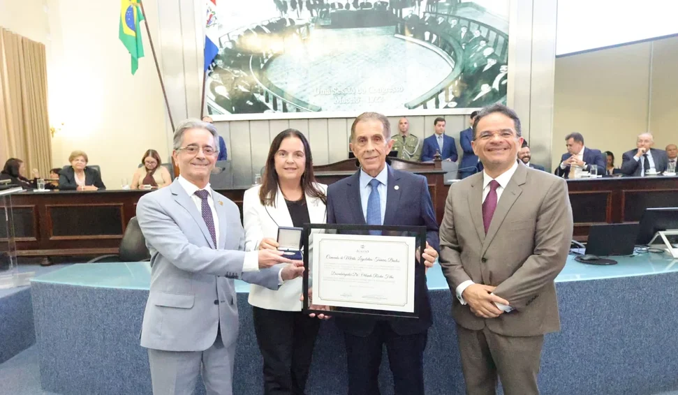 Em sessão solene realizada na segunda-feira, 23, a Assembleia Legislativa concedeu a Comenda Tavares Bastos — maior honraria do Poder Legislativo — ao desembargador Orlando Rocha Filho. A homenagem reconhece os relevantes serviços prestados à sociedade alagoana ao longo de sua trajetória na magistratura, na educação e em iniciativas sociais. A proposta foi apresentada pela deputada Fátima Canuto (MDB), e a cerimônia reuniu, no plenário da Casa, autoridades dos Três Poderes e representantes da sociedade civil.