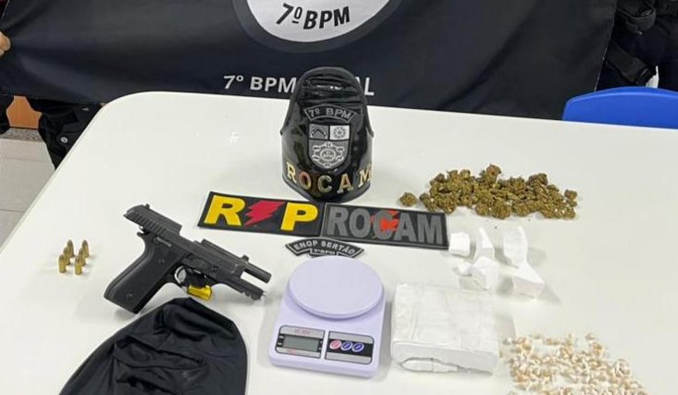 Após buscas intensas na região, o indivíduo foi localizado e recebeu ordem de parada. Ele tentou fugir, mas acabou interceptado e abordado pelos policiais. Além de pilotar sem os equipamentos de segurança obrigatórios, o suspeito relatou ser usuário de entorpecentes e afirmou ter uma pequena quantidade de droga em casa para consumo próprio.