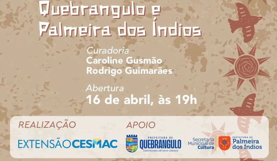 A Galeria Cesmac de Arte Fernando Lopes abre, no próximo dia 16 de abril, às 19h, a exposição “A Arte e a Cultura nas Terras de Graciliano – Quebrangulo e Palmeira dos Índios”. A mostra tem curadoria da professora Caroline Gusmão e do professor Rodrigo Guimarães, com realização da Extensão Cesmac e apoio das prefeituras e secretarias de cultura de Quebrangulo e Palmeira dos Índios.