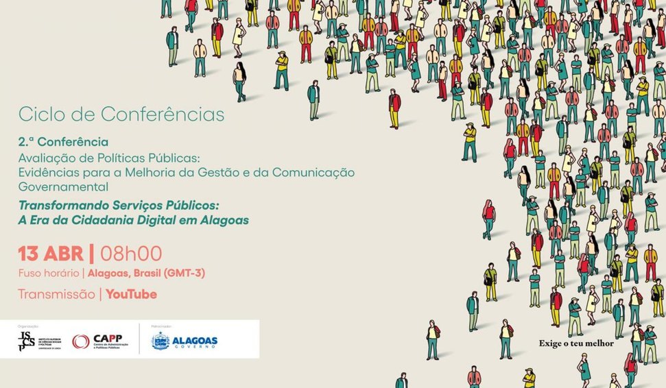 A conferência abordará o tema "Transformando Serviços Públicos: A Era da Cidadania Digital em Alagoas". A sessão integra o Ciclo de Conferências do ISCSP, em parceria com o Centro de Administração e Políticas Públicas (CAPP), e conta com o apoio do Governo de Alagoas.