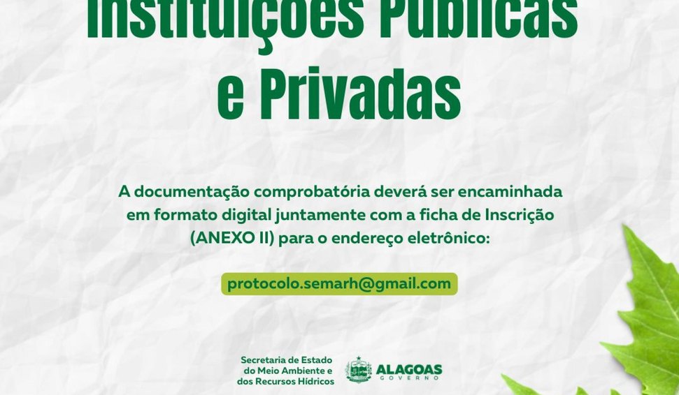 A Secretaria de Estado do Meio Ambiente e dos Recursos Hídricos de Alagoas (Semarh) abriu as inscrições para o Selo Verde Ambiental – Edição 2026, por meio do Edital de Chamamento Público nº 01/2026. O objetivo é reconhecer instituições públicas e privadas que adotam práticas sustentáveis no estado. As inscrições estão disponíveis de 13 de abril a 12 de maio de 2026 e devem ser realizadas exclusivamente via envio da documentação exigida para o e-mail institucional da Semarh.