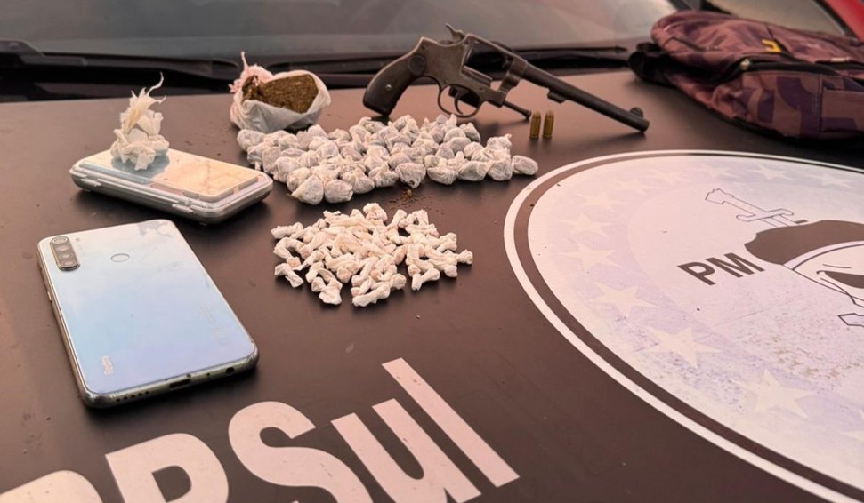 Com o suspeito, os policiais do Pelotão de Operações Policiais Especiais (Pelopes) apreenderam um revólver calibre 32, com duas munições intactas; 118 gramas de maconha (divididas em 63 porções e um pedaço da droga); 9 gramas de crack (62 pedras); 3,5 gramas de cocaína (três porções); além de uma balança de precisão e um aparelho celular.