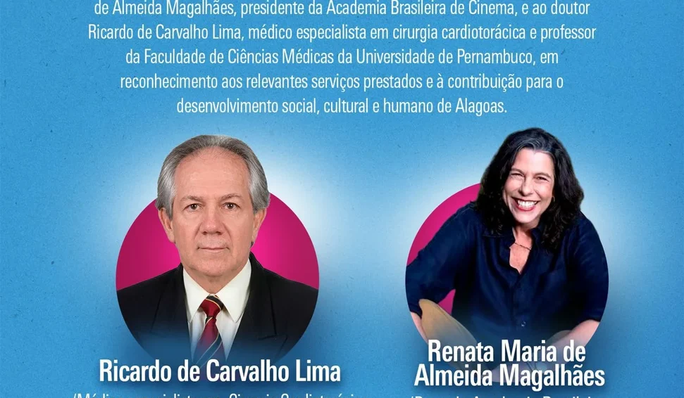 A Assembleia Legislativa realiza, nesta sexta-feira, 17, uma sessão solene para a outorga do Título de Cidadão Honorário de Alagoas ao professor Ricardo de Carvalho Lima e à presidente da Academia Brasileira de Cinema, Renata Maria de Almeida Magalhães, pelos relevantes serviços prestados ao Estado de Alagoas.