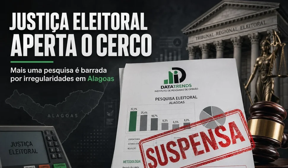 A Justiça Eleitoral de Alagoas voltou a barrar a divulgação de pesquisa eleitoral por irregularidades e reforçou o rigor sobre levantamentos no estado. Em decisão assinada pelo magistrado Sanderson Ferreira da Paz, nesse sábado (25), foi determinada a suspensão da pesquisa registrada sob o nº AL-09299/2026, do Instituto DataTrends.