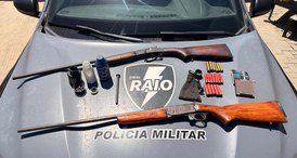 Operação realizada em área de mata resulta na apreensão de espingardas e materiais bélicos; suspeitos conseguiram fugir.