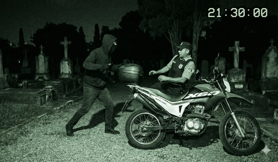 Um assalto ousado foi registrado na noite desta sexta-feira (21) dentro do Cemitério Adonias Queiroz Mafra, localizado no município de Delmiro Gouveia, no Sertão de Alagoas. Um criminoso, que estava encapuzado e portava uma arma de fogo, invadiu o local e roubou a motocicleta de um vigilante que estava de plantão.