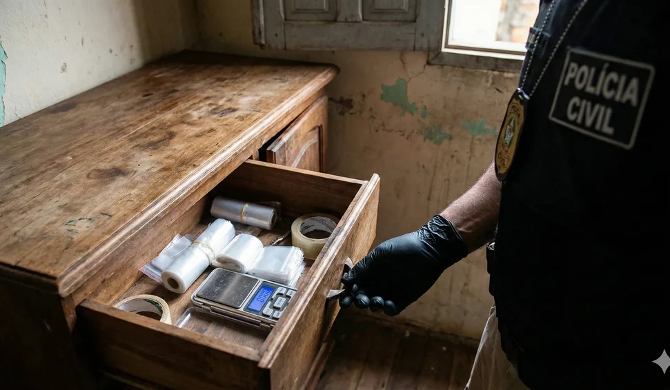 Questionado sobre a denúncia, o suspeito alegou ter apenas material para consumo próprio em sua casa. No entanto, as buscas na residência revelaram um cenário diferente: foram apreendidos 879 gramas de maconha, 21 cartelas de Rohypnol, uma balança de precisão, rolos de plástico filme utilizados para embalagem e quatro aparelhos celulares.