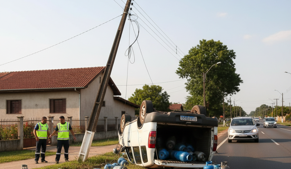 Desgovernado, o veículo colidiu com um poste e virou em frente a uma residência às margens da via. Com o impacto, a carga se soltou e diversos botijões ficaram espalhados pela pista e pelo acostamento. Apesar do risco, não houve explosões.